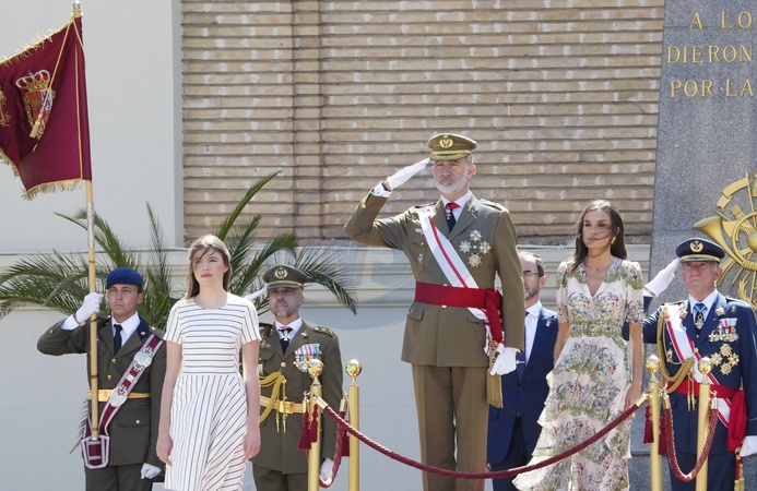 Le roi Felipe VI et la reine Letizia d’Espagne, et la princesse Leonor, lors de la cérémonie de remise des médailles à la nouvelle classe des sous-officiers de l'armée et de la Garde civile à Zaragoza