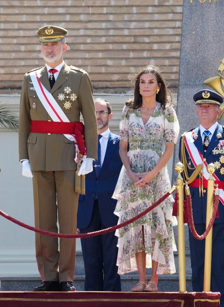 Król Felipe VI i królowa Hiszpanii Letizia oraz księżniczka Leonor podczas ceremonii wręczenia medali dla nowej klasy podoficerów Armii i Gwardii Cywilnej w Saragossie