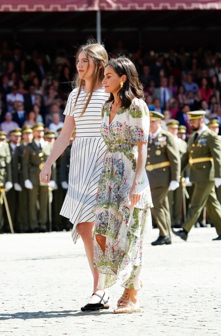 Król Felipe VI i królowa Hiszpanii Letizia oraz księżniczka Leonor podczas ceremonii wręczenia medali dla nowej klasy podoficerów Armii i Gwardii Cywilnej w Saragossie