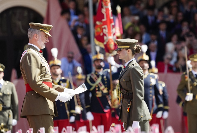 Le roi Felipe VI et la reine Letizia d’Espagne, et la princesse Leonor, lors de la cérémonie de remise des médailles à la nouvelle classe des sous-officiers de l'armée et de la Garde civile à Zaragoza