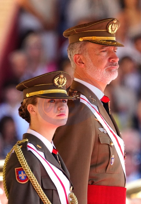 Le roi Felipe VI et la reine Letizia d'Espagne, et la princesse Leonor, lors de la cérémonie de remise des médailles à la nouvelle classe des sous-officiers de l'armée et de la Garde civile à Zaragoza, le 3 juillet 2024. King Felipe VI, Queen Letizia , Crown Princess Leonor and Princess Sofia attend the Delivery of Royal Dispatches of Employment at Zaragoza Military Academy. Crown Princess Leonor received the Grand Cross of Military Merit with white badge and has been appointed Student Ensign by her father, King Felipe VI. Zaragoza - July 3, 2024