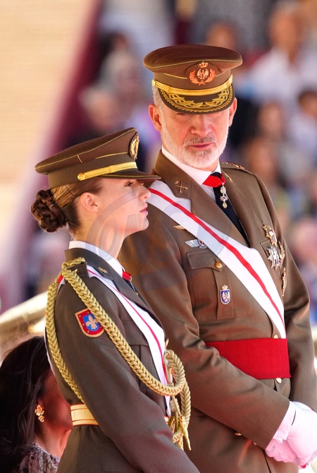 Le roi Felipe VI et la reine Letizia d’Espagne, et la princesse Leonor, lors de la cérémonie de remise des médailles à la nouvelle classe des sous-officiers de l'armée et de la Garde civile à Zaragoza