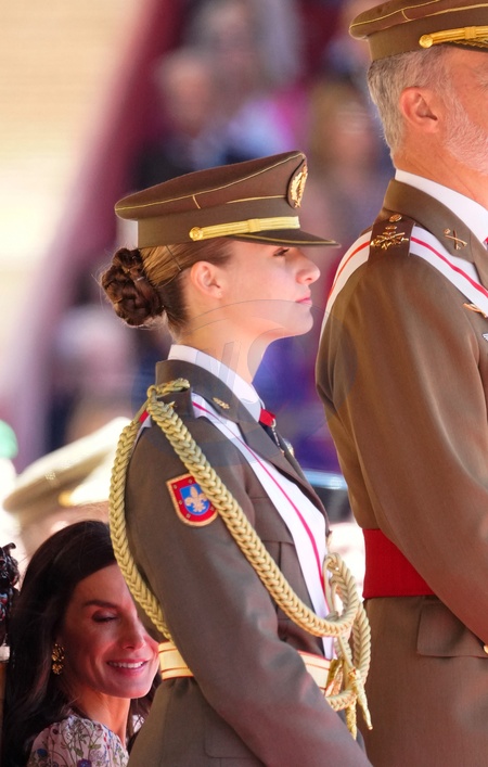 Le roi Felipe VI et la reine Letizia d'Espagne, et la princesse Leonor, lors de la cérémonie de remise des médailles à la nouvelle classe des sous-officiers de l'armée et de la Garde civile à Zaragoza, le 3 juillet 2024. King Felipe VI, Queen Letizia , Crown Princess Leonor and Princess Sofia attend the Delivery of Royal Dispatches of Employment at Zaragoza Military Academy. Crown Princess Leonor received the Grand Cross of Military Merit with white badge and has been appointed Student Ensign by her father, King Felipe VI. Zaragoza - July 3, 2024