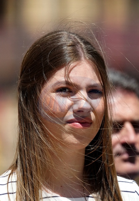 Król Felipe VI i królowa Hiszpanii Letizia oraz księżniczka Leonor podczas ceremonii wręczenia medali dla nowej klasy podoficerów Armii i Gwardii Cywilnej w Saragossie