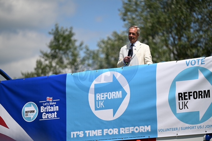 Reform UK leader Nigel Farage speaks at an election rally at the Mercure Great Danes Hotel, Maidstone, United Kingdom, on 24 June 2024., Credit:Stuart Mitchell / Avalon