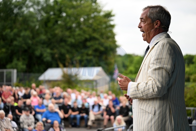 Reform UK leader Nigel Farage speaks at an election rally at Trago Mills, Newton Abbot, United Kingdom, on 24 June 2024., Credit:Stuart Mitchell / Avalon