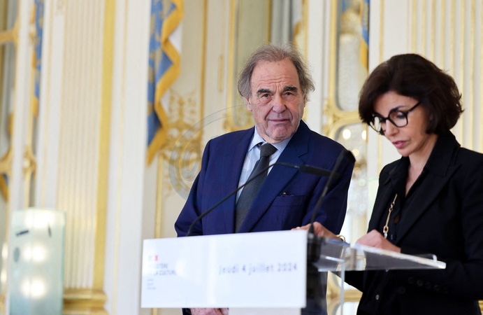 Semi-exclusif - Le réalisateur, scénariste, documentariste, producteur de cinéma et acteur américain Oliver Stone a été élevé au rang de Commandeur de l'ordre des Arts et Lettres par la ministre de la Culture Rachida Dati à Paris, France, le 4 juyillet 2024. © Dominic Jacovides/Bestimage Semi-Exclusive - American film director, screenwriter, documentary filmmaker, film producer and actor Oliver Stone was elevated to the rank of Commander of the Order of Arts and Letters by Minister of Culture Rachida Dati in Paris, France, on July 4, 2024.