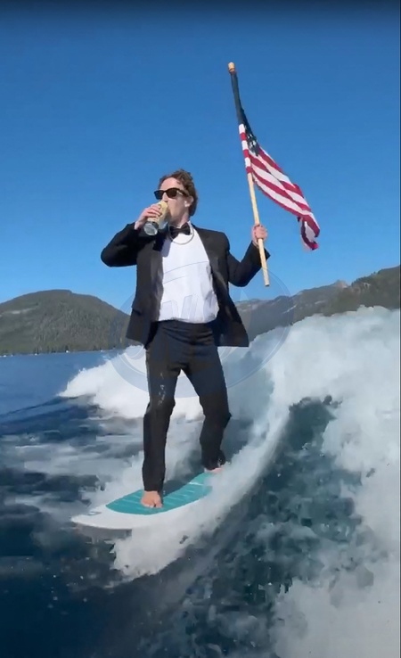 Mark Zuckerberg surfuje w garniturze, z piwem i amerykańską flagą w rękach Fesse podczas uroczystości 4 lipca