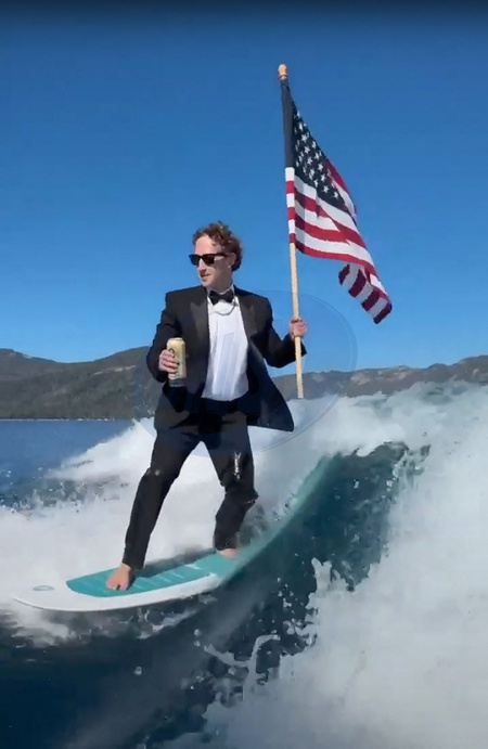 Mark Zuckerberg surfuje w garniturze, z piwem i amerykańską flagą w rękach Fesse podczas uroczystości 4 lipca