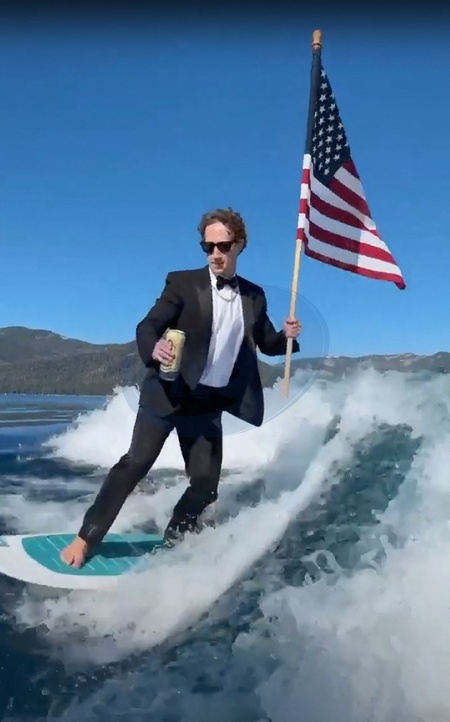 Mark Zuckerberg surfuje w garniturze, z piwem i amerykańską flagą w rękach Fesse podczas uroczystości 4 lipca