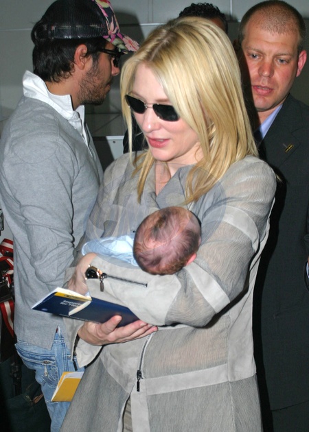 Kate Blanchett z noworodkiem opuszczaja port lotniczy w Nicei