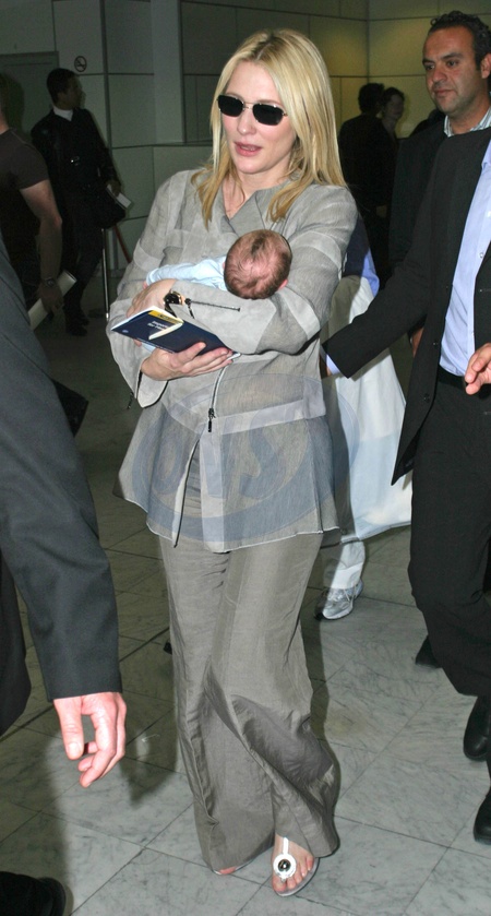 Kate Blanchett z noworodkiem opuszczaja port lotniczy w Nicei