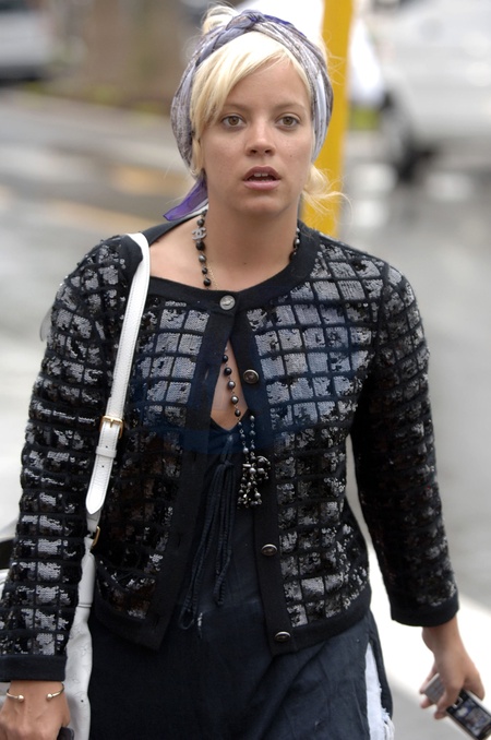 Angielska piosenkarka Lilly Allen spaceruje w deszczu po alei La Croisette w Cannes