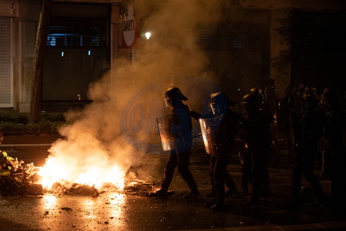 Affrontements entre émeutiers et forces de l'ordre suite à la victoire du nouveau front populaire, lors de la soirée électorale place de la république, nombreux projectiles lancés, barricades incendiées et quelques personnes interpellées, à Paris dans la nuit du 7 juillet 2024. © Florian Poitout/Bestimage Clashes between rioters and police following the victory of the new popular front, during the election evening at place de la republique, numerous projectiles thrown, barricades on fire and a few people arrested, in Paris on the night of July 7, 2024 to July 8, 2024. Clashes between rioters and police following the victory of the new popular front, during the election evening at place de la republique, numerous projectiles thrown, barricades on fire and a few people arrested, in Paris on the night of July 7, 2024 to July 8, 2024, photo by Florian Poitout