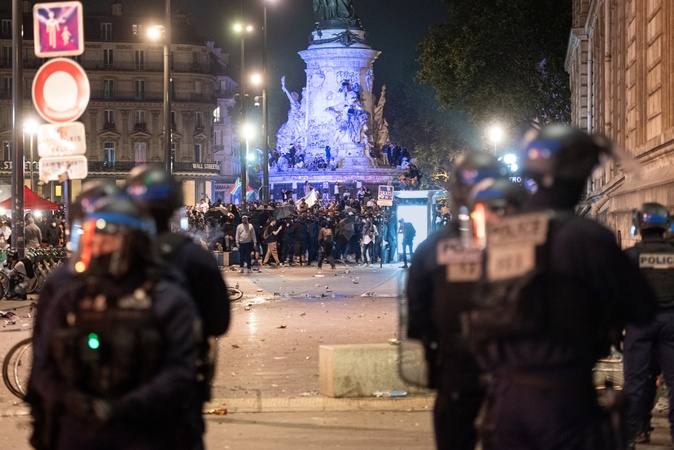 Affrontements entre émeutiers et forces de l'ordre suite à la victoire du nouveau front populaire, lors de la soirée électorale place de la république, nombreux projectiles lancés, barricades incendiées et quelques personnes interpellées, à Paris dans la nuit du 7 juillet 2024. © Florian Poitout/Bestimage Clashes between rioters and police following the victory of the new popular front, during the election evening at place de la republique, numerous projectiles thrown, barricades on fire and a few people arrested, in Paris on the night of July 7, 2024 to July 8, 2024. Clashes between rioters and police following the victory of the new popular front, during the election evening at place de la republique, numerous projectiles thrown, barricades on fire and a few people arrested, in Paris on the night of July 7, 2024 to July 8, 2024, photo by Florian Poitout