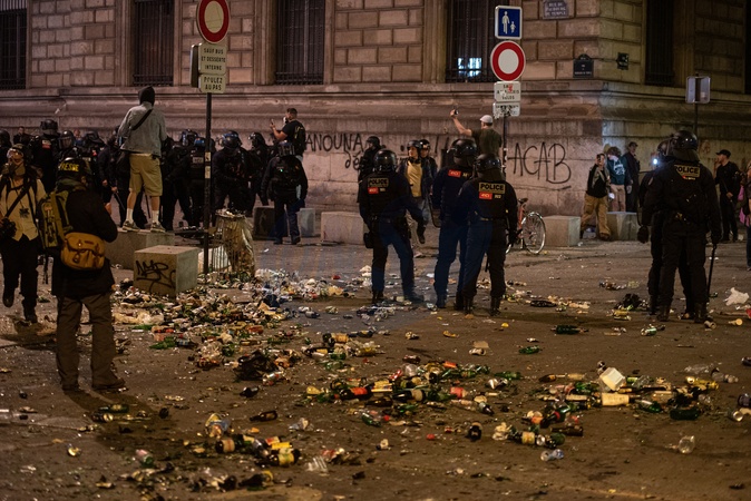 Affrontements entre émeutiers et forces de l'ordre suite à la victoire du nouveau front populaire, lors de la soirée électorale place de la république, nombreux projectiles lancés, barricades incendiées et quelques personnes interpellées, à Paris dans la nuit du 7 juillet 2024. © Florian Poitout/Bestimage Clashes between rioters and police following the victory of the new popular front, during the election evening at place de la republique, numerous projectiles thrown, barricades on fire and a few people arrested, in Paris on the night of July 7, 2024 to July 8, 2024. Clashes between rioters and police following the victory of the new popular front, during the election evening at place de la republique, numerous projectiles thrown, barricades on fire and a few people arrested, in Paris on the night of July 7, 2024 to July 8, 2024, photo by Florian Poitout