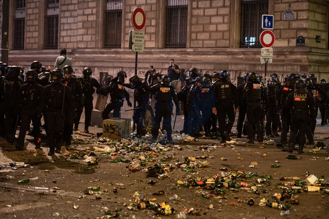 Affrontements entre émeutiers et forces de l'ordre suite à la victoire du nouveau front populaire, lors de la soirée électorale place de la république, nombreux projectiles lancés, barricades incendiées et quelques personnes interpellées, à Paris dans la nuit du 7 juillet 2024. © Florian Poitout/Bestimage Clashes between rioters and police following the victory of the new popular front, during the election evening at place de la republique, numerous projectiles thrown, barricades on fire and a few people arrested, in Paris on the night of July 7, 2024 to July 8, 2024. Clashes between rioters and police following the victory of the new popular front, during the election evening at place de la republique, numerous projectiles thrown, barricades on fire and a few people arrested, in Paris on the night of July 7, 2024 to July 8, 2024, photo by Florian Poitout