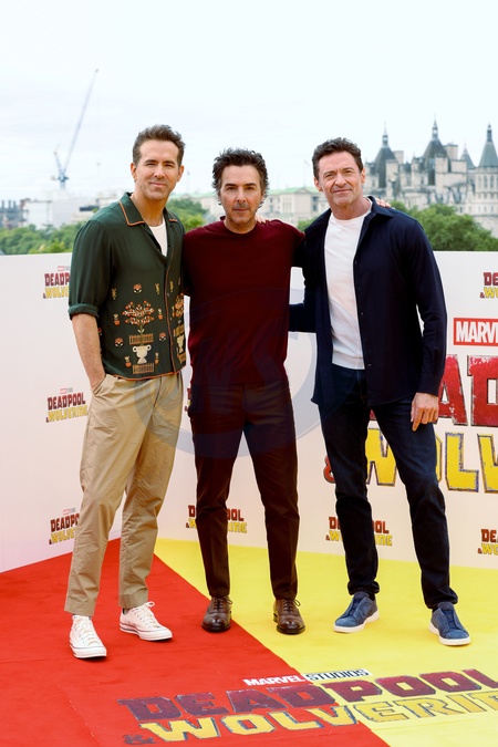 Ryan Reynolds, Shawn Levy and Hugh Jackman at the Deadpool & Wolverine UK Photocall held at at The Savoy London in London, UK, on 12th July, 2024, Credit:James Shaw / Avalon