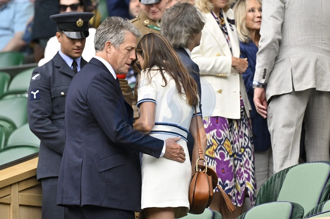 Hugh Grant and his wife Anna Elisabet Eberstein in the stands during the day twelve of the Wimbledon Tennis Championships at the All England Lawn Tennis and Croquet Club on July 11, 2024 in London, England. © Chryslene Caillaud/Panoramic/Bestimage