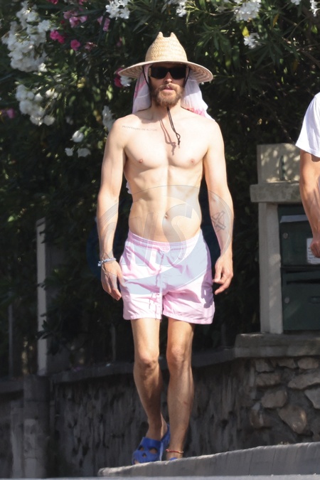 Exclusif - Jared Leto se promène torse nu dans les rues de Saint-Tropez, Côte d'Azur, France, le 12 juillet 2024. No Web pour la Belgique et la Suisse Exclusive - For Germany Call For Price - Jared Leto walks shirtless through the streets of Saint-Tropez, French Riviera, France, on July 12, 2024.