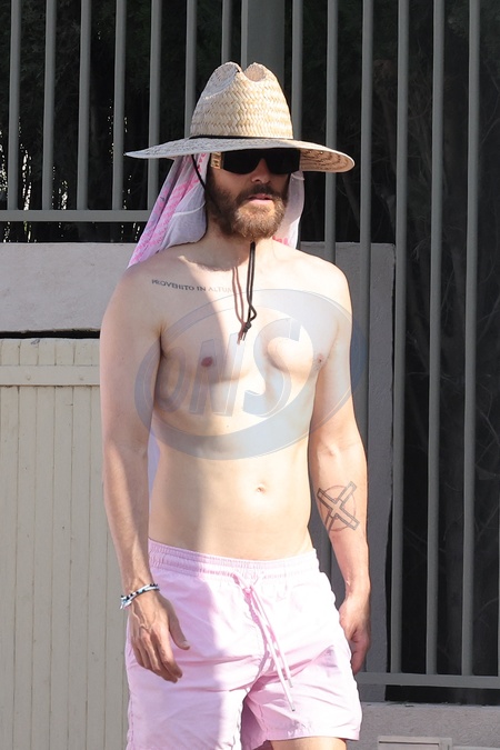 Exclusif - Jared Leto se promène torse nu dans les rues de Saint-Tropez, Côte d'Azur, France, le 12 juillet 2024. No Web pour la Belgique et la Suisse Exclusive - For Germany Call For Price - Jared Leto walks shirtless through the streets of Saint-Tropez, French Riviera, France, on July 12, 2024.