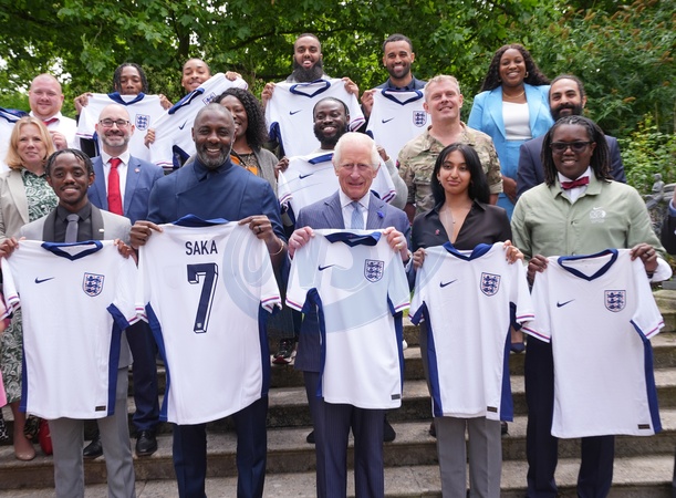 King Charles III (centre) with Idris Elba (centre left) and young people holding England football team shirts in support of the England football team as they attend an event for The King's Trust to discuss youth opportunity, at St James's Palace in central London. The King and Mr Elba, an alumnus of The King's Trust (formerly known as The Prince's Trust), are meeting about the charity's ongoing work to support young people, and creating positive opportunities and initiatives which might help address youth violence in the UK, as well as the collaboration in Sierra Leone between the Prince's Trust International and the Elba Hope Foundation., Credit:Yui Mok / Avalon