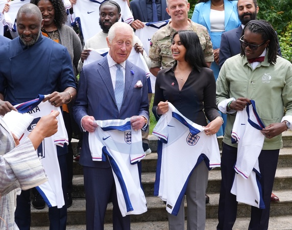 King Charles III (2nd left) with Idris Elba (left) and young people holding England football team shirts in support of the England football team as they attend an event for The King's Trust to discuss youth opportunity, at St James's Palace in central London. The King and Mr Elba, an alumnus of The King's Trust (formerly known as The Prince's Trust), are meeting about the charity's ongoing work to support young people, and creating positive opportunities and initiatives which might help address youth violence in the UK, as well as the collaboration in Sierra Leone between the Prince's Trust International and the Elba Hope Foundation., Credit:Yui Mok / Avalon