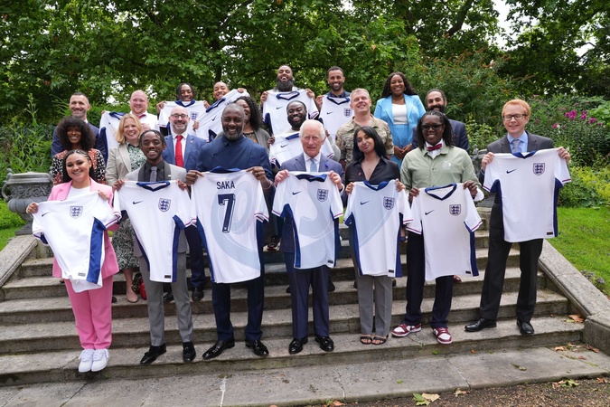 King Charles III (centre) with Idris Elba (centre left) and young people hold England football team shirts in support of the England football team as they attend an event for The King's Trust to discuss youth opportunity, at St James's Palace in central London. The King and Mr Elba, an alumnus of The King's Trust (formerly known as The Prince's Trust), are meeting about the charity's ongoing work to support young people, and creating positive opportunities and initiatives which might help address youth violence in the UK, as well as the collaboration in Sierra Leone between the Prince's Trust International and the Elba Hope Foundation., Credit:Yui Mok / Avalon
