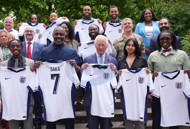King Charles III (centre) with Idris Elba (centre left) and young people hold England football team shirts in support of the England football team as they attend an event for The King's Trust to discuss youth opportunity, at St James's Palace in central London. The King and Mr Elba, an alumnus of The King's Trust (formerly known as The Prince's Trust), are meeting about the charity's ongoing work to support young people, and creating positive opportunities and initiatives which might help address youth violence in the UK, as well as the collaboration in Sierra Leone between the Prince's Trust International and the Elba Hope Foundation., Credit:Yui Mok / Avalon