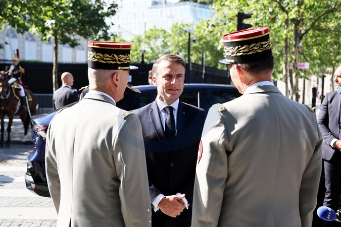Le président de la République française Emmanuel Macron, accompagné du général Thierry Burkhard, chef d'état-major des armées au départ de la cérémonie du 144ème défilé militaire du 14 juillet, jour de la Fête Nationale à Paris, France, le 14 juillet 2024. © Dominique Jacovides/Bestimage French President and Chief of Staff of the French Armed Forces (CEMA) during the Bastille Day parade, in Paris, France., on July 14, 2024.