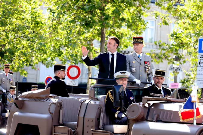 Prezydent Republiki Francuskiej Emmanuel Macron w towarzystwie generała Thierry’ego Burkharda, szefa sztabu sił zbrojnych, na pokładzie „samochodu dowodzenia” podczas ceremonii 144. defilady wojskowej 14 lipca, w Święto Narodowe, w Paryżu