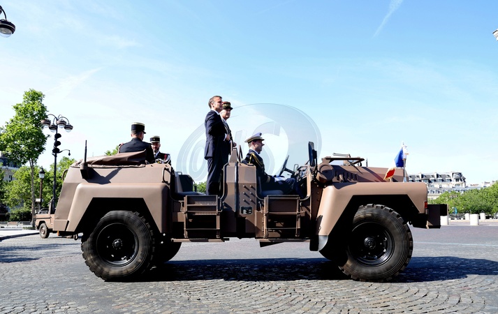 Le président de la République française Emmanuel Macron, accompagné du général Thierry Burkhard, chef d'état-major des armées à bord d'un véhicule léger de reconnaissance et de soutien (VLRA) "command car" lors de la cérémonie du 144ème défilé militaire du 14 juillet, jour de la Fête Nationale à Paris, France, le 14 juillet 2024. © Dominique Jacovides/Bestimage French President and Chief of Staff of the French Armed Forces (CEMA) during the Bastille Day parade, in Paris, France., on July 14, 2024.