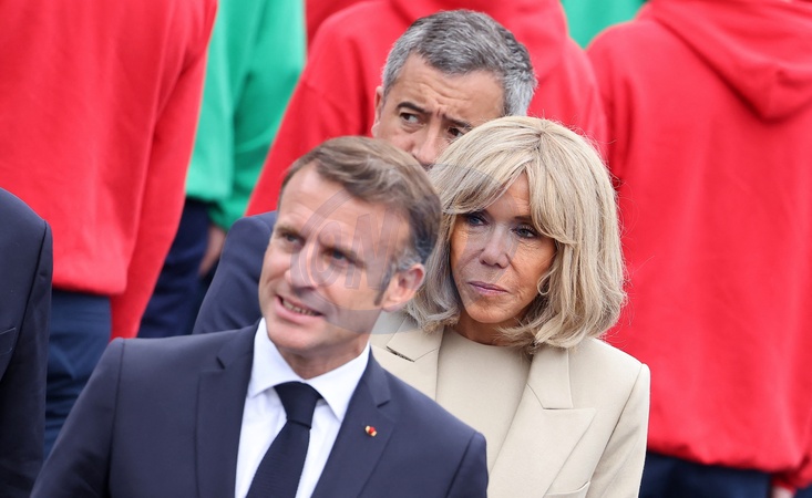 Prezydent Emmanuel Macron i jego żona Pierwsza Dama Brigitte Macron podczas spaceru po zakończeniu ceremonii 144. defilady wojskowej 14 lipca, w Święto Narodowe, w Paryżu