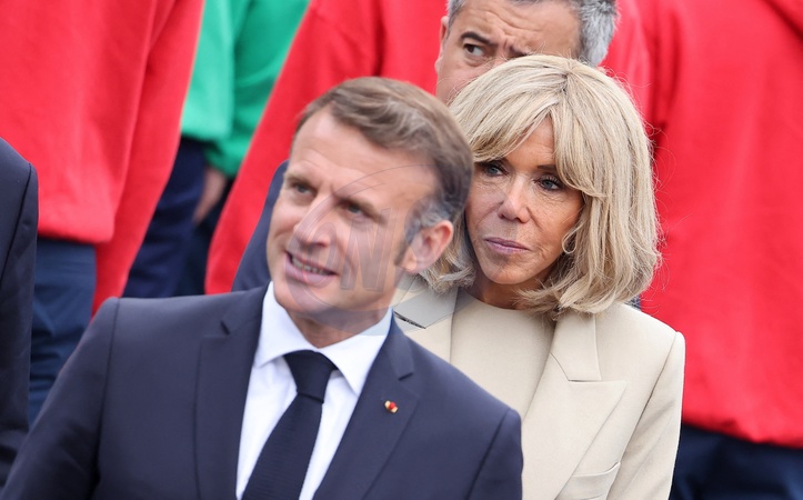 Prezydent Emmanuel Macron i jego żona Pierwsza Dama Brigitte Macron podczas spaceru po zakończeniu ceremonii 144. defilady wojskowej 14 lipca, w Święto Narodowe, w Paryżu