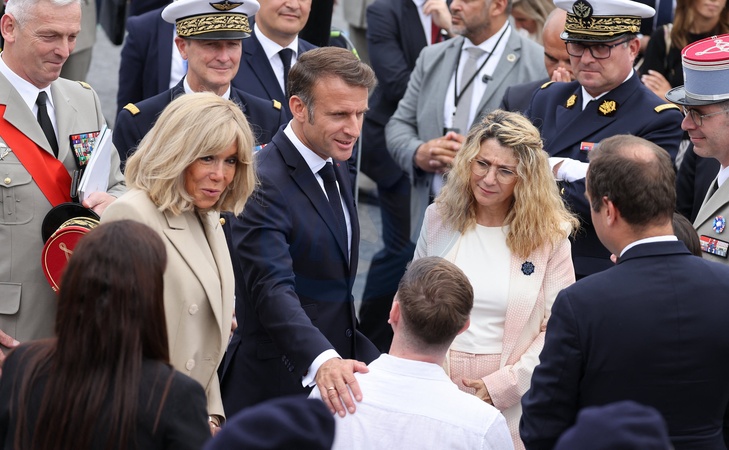 Prezydent Emmanuel Macron i jego żona Pierwsza Dama Brigitte Macron podczas spaceru po zakończeniu ceremonii 144. defilady wojskowej 14 lipca, w Święto Narodowe, w Paryżu