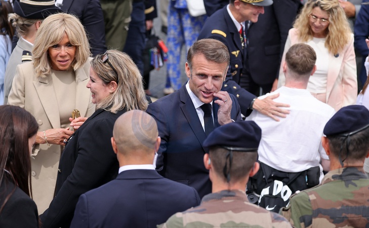 Prezydent Emmanuel Macron i jego żona Pierwsza Dama Brigitte Macron podczas spaceru po zakończeniu ceremonii 144. defilady wojskowej 14 lipca, w Święto Narodowe, w Paryżu