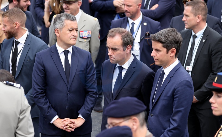 Gérald Darmanin, ministre de l'Intérieur et des Outre-mer, Sébastien Lecornu, ministre des Armées, et Gabriel Attal, Premier ministre, lors d'un bain de foule à la cérémonie du 144ème défilé militaire du 14 juillet, jour de la Fête Nationale, à Paris, France, le 14 juillet 2024. © Dominique Jacovides/Bestimage rench President during the Bastille Day parade, in Paris, France, on July 14, 2024.