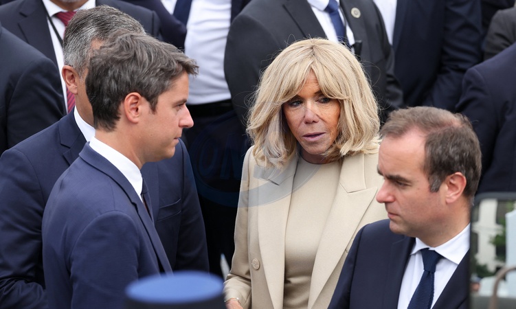 Gérald Darmanin, ministre de l'Intérieur et des Outre-mer, Gabriel Attal, Premier ministre, Sébastien Lecornu, ministre des Armées, et la Première Dame française Brigitte Macron lors d'un bain de foule à la cérémonie du 144ème défilé militaire du 14 juillet, jour de la Fête Nationale, à Paris, France, le 14 juillet 2024. © Dominique Jacovides/Bestimage rench President during the Bastille Day parade, in Paris, France, on July 14, 2024.