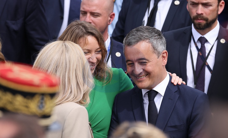 La Première Dame française Brigitte Macron, Gérald Darmanin, ministre de l'Intérieur et des Outre-mer, et sa femme Rose-Marie Devillers lors d'un bain de foule à la cérémonie du 144ème défilé militaire du 14 juillet, jour de la Fête Nationale, à Paris, France, le 14 juillet 2024. © Dominique Jacovides/Bestimage rench President during the Bastille Day parade, in Paris, France, on July 14, 2024.