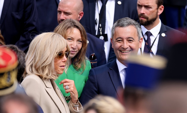 La Première Dame française Brigitte Macron, Gérald Darmanin, ministre de l'Intérieur et des Outre-mer, et sa femme Rose-Marie Devillers lors d'un bain de foule à la cérémonie du 144ème défilé militaire du 14 juillet, jour de la Fête Nationale, à Paris, France, le 14 juillet 2024. © Dominique Jacovides/Bestimage rench President during the Bastille Day parade, in Paris, France, on July 14, 2024.