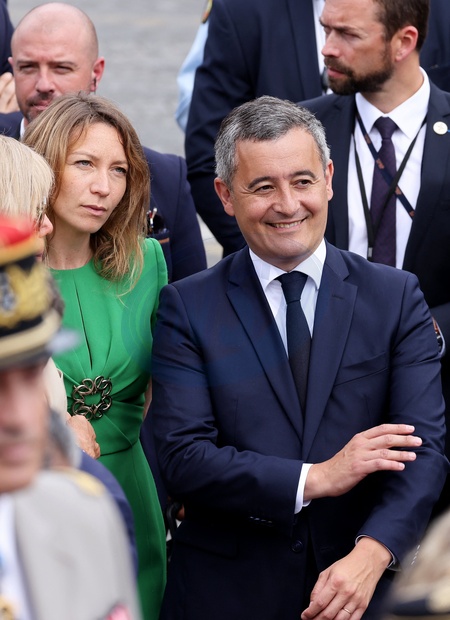 Gérald Darmanin, ministre de l'Intérieur et des Outre-mer, et sa femme Rose-Marie Devillers lors d'un bain de foule à la cérémonie du 144ème défilé militaire du 14 juillet, jour de la Fête Nationale, à Paris, France, le 14 juillet 2024. © Dominique Jacovides/Bestimage rench President during the Bastille Day parade, in Paris, France, on July 14, 2024.