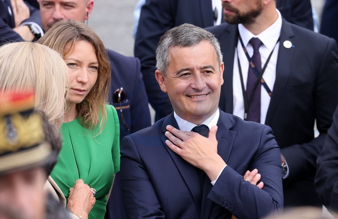 Gérald Darmanin, ministre de l'Intérieur et des Outre-mer, et sa femme Rose-Marie Devillers lors d'un bain de foule à la cérémonie du 144ème défilé militaire du 14 juillet, jour de la Fête Nationale, à Paris, France, le 14 juillet 2024. © Dominique Jacovides/Bestimage rench President during the Bastille Day parade, in Paris, France, on July 14, 2024.