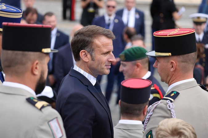 Prezydent Emmanuel Macron i jego żona Pierwsza Dama Brigitte Macron podczas spaceru po zakończeniu ceremonii 144. defilady wojskowej 14 lipca, w Święto Narodowe, w Paryżu