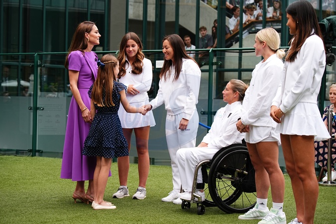 The Princess of Wales and Princess Charlottemeeting Yuriko Lily Miyazaki on day fourteen of the 2024 Wimbledon Championships at the All England Lawn Tennis and Croquet Club, London, ahead of Kate presenting the trophy to the winner of the men's final. RESTRICTIONS: Editorial use only. No commercial use without prior written consent of the AELTC. Still image use only - no moving images to emulate broadcast. No superimposing or removal of sponsor/ad logos., Credit:Aaron Chown / Avalon