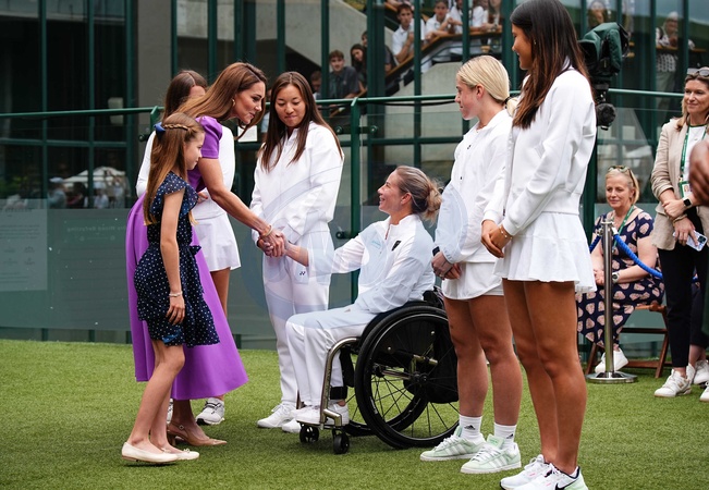 The Princess of Wales and Princess Charlottemeeting Lucy Shuker on day fourteen of the 2024 Wimbledon Championships at the All England Lawn Tennis and Croquet Club, London, ahead of Kate presenting the trophy to the winner of the men's final. RESTRICTIONS: Editorial use only. No commercial use without prior written consent of the AELTC. Still image use only - no moving images to emulate broadcast. No superimposing or removal of sponsor/ad logos., Credit:Aaron Chown / Avalon