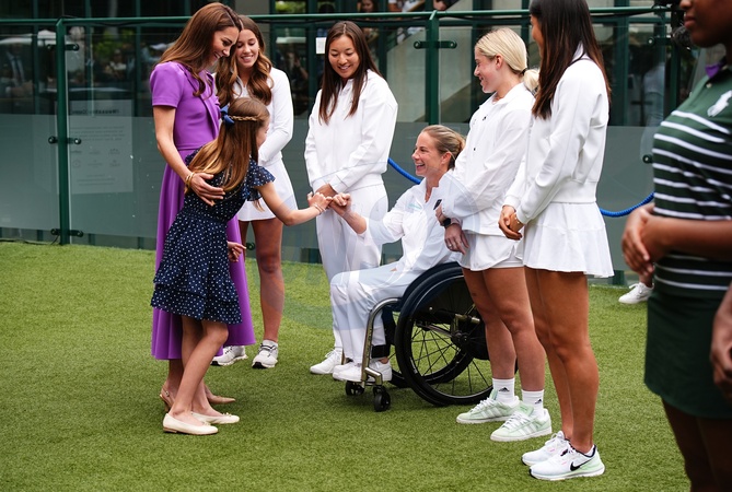 The Princess of Wales and Princess Charlottemeeting Lucy Shuker on day fourteen of the 2024 Wimbledon Championships at the All England Lawn Tennis and Croquet Club, London, ahead of Kate presenting the trophy to the winner of the men's final. RESTRICTIONS: Editorial use only. No commercial use without prior written consent of the AELTC. Still image use only - no moving images to emulate broadcast. No superimposing or removal of sponsor/ad logos., Credit:Aaron Chown / Avalon