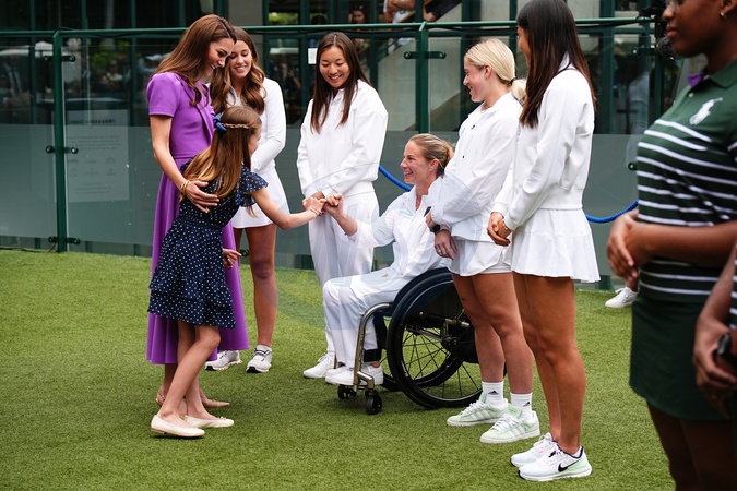 The Princess of Wales and Princess Charlottemeeting Lucy Shuker on day fourteen of the 2024 Wimbledon Championships at the All England Lawn Tennis and Croquet Club, London, ahead of Kate presenting the trophy to the winner of the men's final. RESTRICTIONS: Editorial use only. No commercial use without prior written consent of the AELTC. Still image use only - no moving images to emulate broadcast. No superimposing or removal of sponsor/ad logos., Credit:Aaron Chown / Avalon