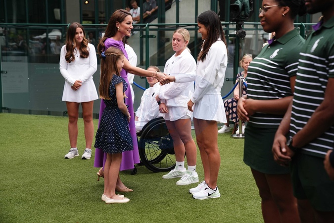 The Princess of Wales and Princess Charlottemeeting Emma Raducanu on day fourteen of the 2024 Wimbledon Championships at the All England Lawn Tennis and Croquet Club, London, ahead of Kate presenting the trophy to the winner of the men's final. RESTRICTIONS: Editorial use only. No commercial use without prior written consent of the AELTC. Still image use only - no moving images to emulate broadcast. No superimposing or removal of sponsor/ad logos., Credit:Aaron Chown / Avalon