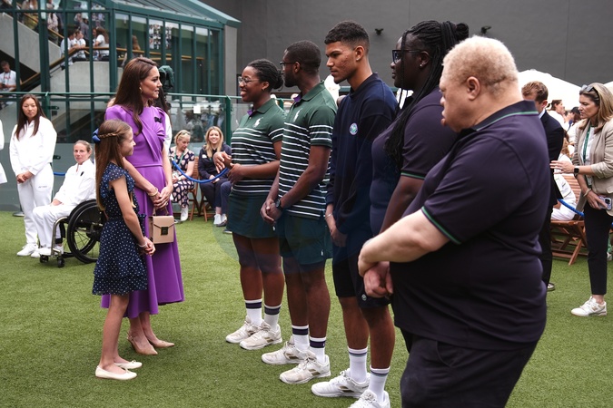The Princess of Wales and Princess Charlottemeeting ground staff on day fourteen of the 2024 Wimbledon Championships at the All England Lawn Tennis and Croquet Club, London, ahead of Kate presenting the trophy to the winner of the men's final. RESTRICTIONS: Editorial use only. No commercial use without prior written consent of the AELTC. Still image use only - no moving images to emulate broadcast. No superimposing or removal of sponsor/ad logos., Credit:Aaron Chown / Avalon
