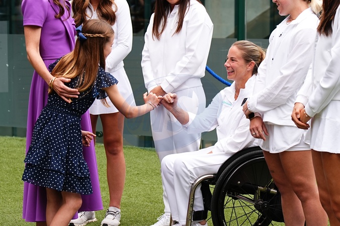 The Princess of Wales and Princess Charlottemeeting Lucy Shuker on day fourteen of the 2024 Wimbledon Championships at the All England Lawn Tennis and Croquet Club, London, ahead of Kate presenting the trophy to the winner of the men's final. RESTRICTIONS: Editorial use only. No commercial use without prior written consent of the AELTC. Still image use only - no moving images to emulate broadcast. No superimposing or removal of sponsor/ad logos., Credit:Aaron Chown / Avalon
